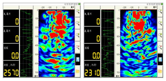 為尋找造成地下防水工程滲漏的原因,以更好地控制防水工程質(zhì)量,雨虹修繕引進(jìn)超聲波斷面成像儀,可用于混凝土結(jié)構(gòu)中的外部侵入物、缺陷、裂縫以及管道及蜂窩等缺陷的無損檢測(cè)。如果混凝土內(nèi)部的缺陷足夠大,激發(fā)的超聲波會(huì)被該缺陷提前發(fā)反射,因?yàn)榉瓷渚€路徑更短,由缺陷反射的信號(hào)會(huì)早于混凝土底面反射的信號(hào)到達(dá)接收端。信號(hào)處理軟件依據(jù)每排換能器接收到的反射脈沖的到達(dá)時(shí)間,來推斷混凝土內(nèi)部缺陷的位置,最大可探查1.8m。