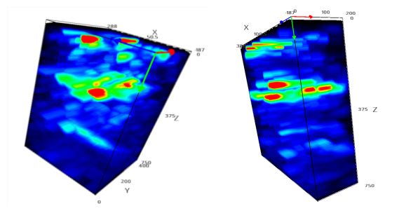 三維立體掃描,側(cè)墻部位其內(nèi)部孔隙率非常多,多集中在表層以及200mm到300mm之間區(qū)域,且存在貫穿性裂縫。