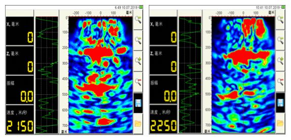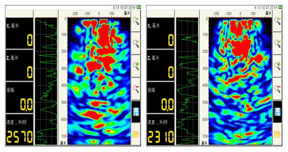 單點(diǎn)掃描,大多數(shù)點(diǎn)從表層至300mm處均有連續(xù)性缺陷。內(nèi)部孔隙率也非常高,目前存在滲水情況。對(duì)照分析,內(nèi)部存在連續(xù)性的缺陷,符合現(xiàn)場(chǎng)滲漏水;