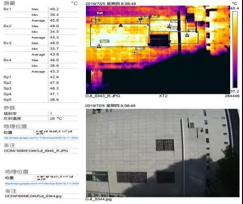 紅外熱成像儀通過外部溫度變化將建筑外墻表面輻射出的不可見紅外射線轉(zhuǎn)變?yōu)榭梢姷臒釄D像,通過捕捉物體輻射出的紅外射線的強(qiáng)弱程度判斷建筑物的溫度分布狀況,從而判斷空鼓、滲漏的部位。再通過FLIR專用軟件對拍攝的紅外熱成像圖進(jìn)行溫度分析,從中判斷空鼓的部位以及滲水的部位。