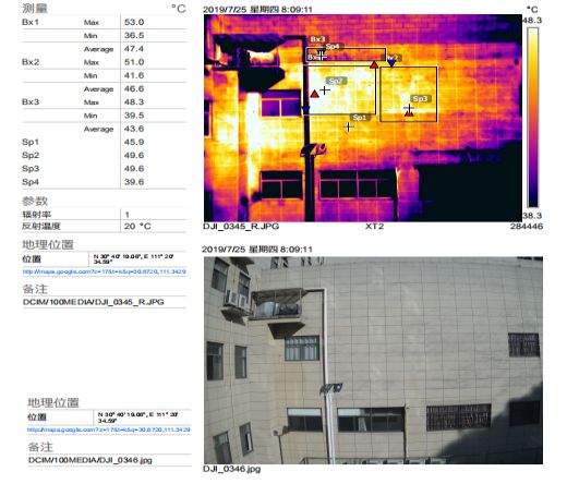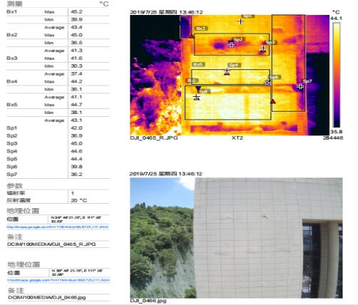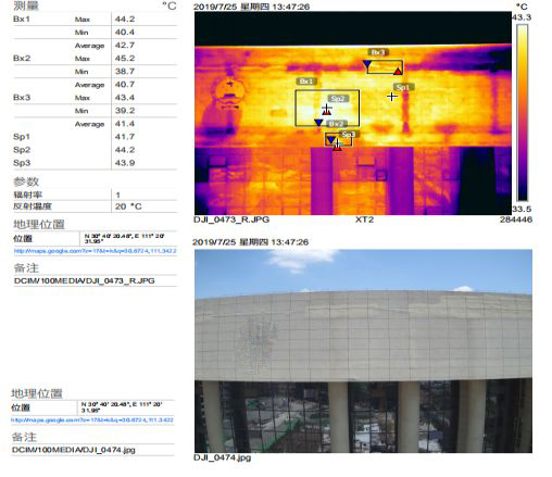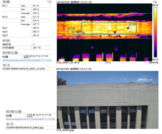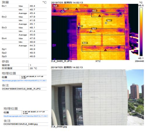 某地區(qū)中級人民法院外墻無機(jī)保溫砂漿保溫層出現(xiàn)脫落、滲漏現(xiàn)象,經(jīng)過勘查檢測(檢測設(shè)備為無人機(jī)搭載紅外熱成像雙光攝像頭),判斷整體外墻目前存在的各類缺陷及其嚴(yán)重程度,從而尋找合理、有效的解決方案,解決外墻問題,消除外墻帶來的安全隱患。