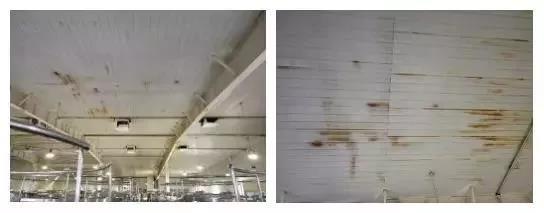 某生產(chǎn)車間頂棚防腐項目頂棚采用金屬板、巖棉復(fù)合鋼板,由于金屬頂棚板面防腐漆質(zhì)量較差,生產(chǎn)車間內(nèi)部溫度、濕度較高,最終導(dǎo)致室內(nèi)頂棚金屬板銹蝕嚴重。