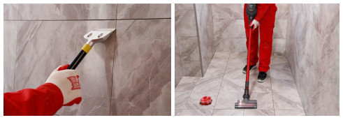 用吸塵器或毛刷清理粉塵:使用粉塵吸塵器將瓷磚縫隙內部的粉塵吸干凈,瓷磚縫隙兩側2cm寬采用抹布擦洗干凈,保證瓷磚縫隙內不潮濕,無粉塵、顆粒、油漬、疏松物等,同時清潔瓷磚表面污染物。如擔心使用吸塵器清潔仍不夠徹底,可繼續(xù)采用毛刷清理吸塵器處理不到或難以處理的位置,保證所有的瓷磚縫隙干燥無粉塵。