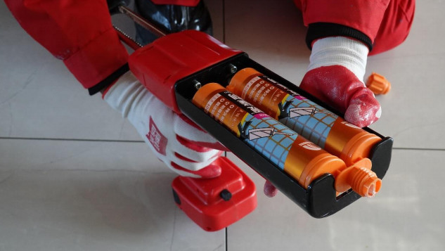 安裝靚縫劑專用膠槍:安裝混合管前先用膠槍擠壓膠管直至AB組分全都從出料口出料為止,隨后將混合管安裝至出料口并套用優(yōu)質省力膠槍。