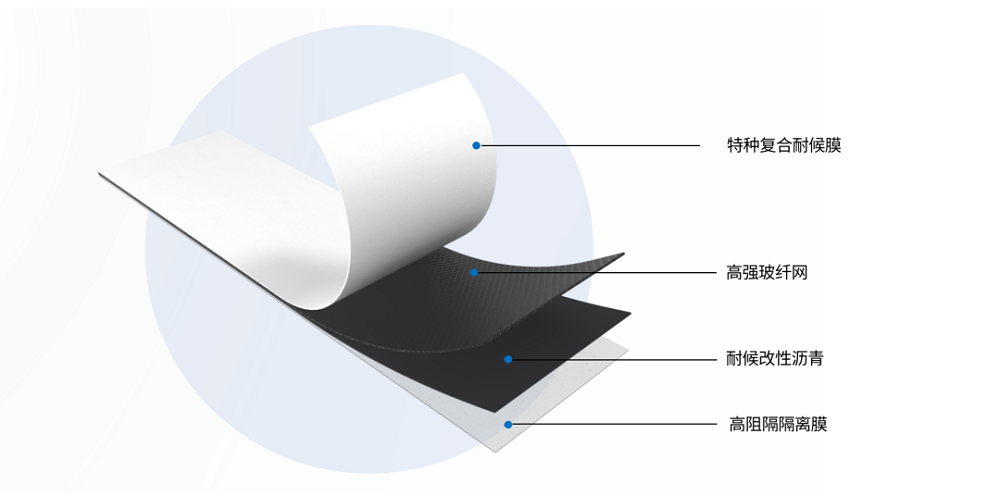 可外露使用5-8年:自主研發(fā)的復(fù)合耐候膜與耐候改性瀝青,具有優(yōu)異的耐候性和尺寸穩(wěn)定性,可使卷材長期保持粘性。人工加速老化試驗后,拉力強度可保持≧700N/50mm*。